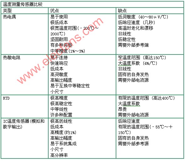 溫度傳感器有四種主要類型:熱電偶、熱敏電阻、電阻溫度檢測器(RTD)和IC溫度傳感器(見下表)。IC溫度傳感器又包括模擬輸出和數字輸出兩種類型。